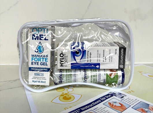 The DRYEYEKIT includes the Optimel Manuka Honey Dry Eye Drops which are formulated for
